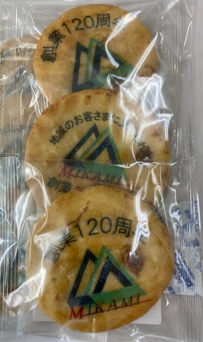 また、120周年の記念として オリジナル印刷せんべい を製作し、ご来社いただいたお客様にお渡ししており